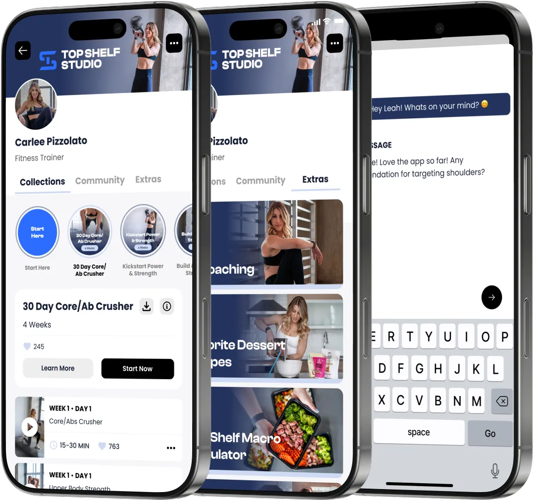 The Top Shelf Studio subscription gives you ongoing access to full-body strength, core, conditioning, and mobility programs designed to fit your schedule. Each workout is designed to help you progress with movements that enhance strength, build muscle, and improve endurance.